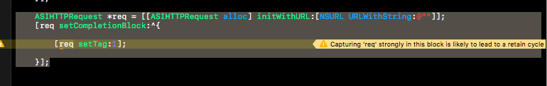 ASIHTTP 的 setCompletionBlock 方法会对传入的 block 进行强引用。 所以 block 内部在引用 reuqest 对象的时候,就需要加上 __weak 修饰符了。