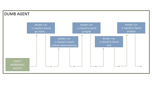 一个哑代理只需要安装Docker。当有代码被提交到git仓库时,代理会创建一个空的工作空间,如/work/1表示版本#1。接下来,代理会协调构建中每一步使用的容器及其中用到的工具。容器的运行顺序也可以进行切换而不需要复杂的准备过程。代理会将工作空间以卷组的方式传递给容器,容器中的工具完成对应操作,并将文件写回工作空间,最后容器会被销毁,接下来工作空间继续被传递给下一个容器。