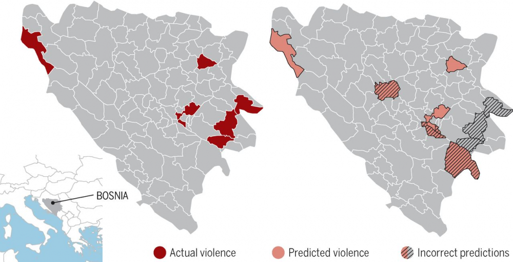 图 1. 波斯尼亚市级水平的内战暴力预测。(左图)1995 年 6 月在 7 个市级单位实际发生的暴力事件(暗红)。(右图)[7] 中描述的时空模型预测到的暴力(淡红)。画有斜纹的图案表示不正确的预测。尽管有 4 个市级单位的冲突得到了正确的预测,但该模型还是错过了 3 个实际发生的冲突,并错误地预测了 4 个市级单位会发生暴力。而且正如大多数冲突预测案例一样,许多区域仍然是和平的而且也符合预测(以灰色表示)。