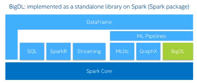 BigDL库支持Spark 1.5、1.6和2.0版本。BigDL库中有把Spark RDDs转换为BigDL DataSet的方法,并且可以直接与Spark ML Pipelines一起使用。