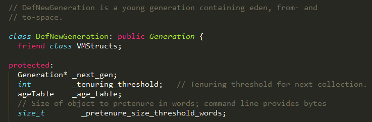 DefNewGeneration 是一个 young generation ,包含了 eden、from and to 内存区,当虚拟机启动参数中没有指定垃圾回收算法时,默认使用该方式实现新生代,定义如下: