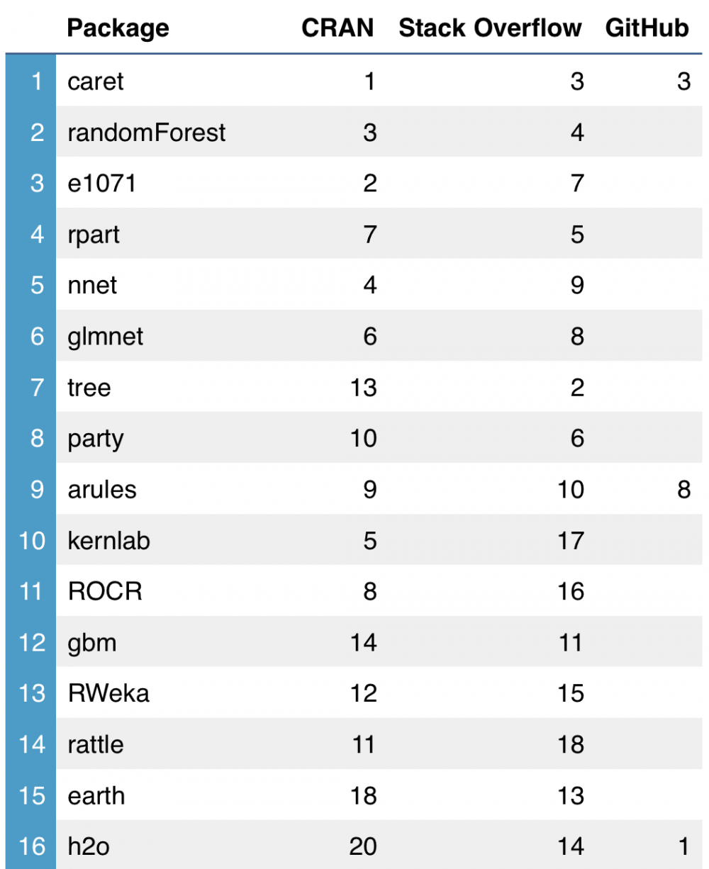 caret 排名第一也许并不奇怪。它是一个用于创建机器学习工作流的通用软件包,能很好地与一些算法特定的软件包(排名靠后)整合在一起。