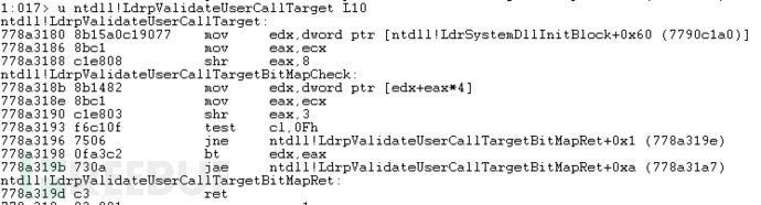根据趋势科技的研究,函数LdrValidateUserCallTarget调用CFG验证函数是否有效使用了间接调用,如下图所示: