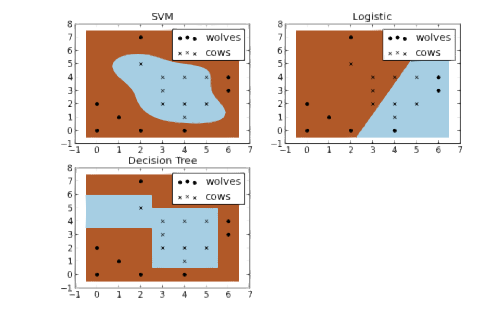 现在假装你是一个农夫,那么你就有一个问题——需要建立一个篱笆,以保护你的牛不被狼攻击。但是在哪里筑篱笆合适呢?如果你真的是一个用数据说话的农夫,一种方法是基于牛和狼在你的牧场的位置,建立一个分类器。通过对下图中几种不同类型的分类器进行比较,我们看到 SVM 能很好地区分牛群和狼群。我认为这些图很好地说明了使用非线性分类器的好处,可以看到逻辑回归和决策树模型的分类边界都是直线。