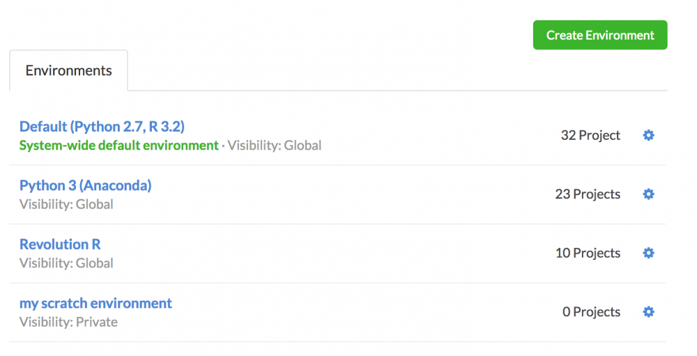 假如你的一些用户使用Python3,一些使用Python2。或者一些用户使用标准R发行版,一些使用Revolution Analytics的R发行版。你可以为每个配置创建环境,数据科学家可以选择他们工作时所需要的: