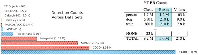 | Summary of dataset statistics. Bar Chart: Relative number of detections in existing image (red) and video (blue) data sets. The YouTube BoundingBoxes dataset (YT-BB) is at the bottom, is at the bottom. Table: The three columns are counts for: classification annotations, bounding boxes, and unique videos with bounding boxes. Full details on the dataset can be found in the preprint . |