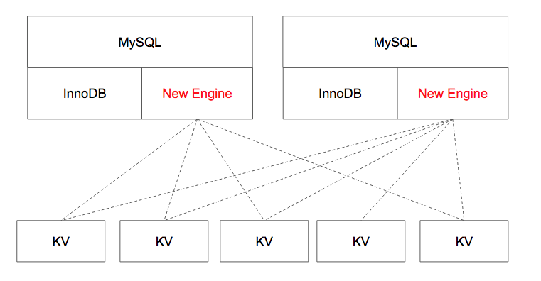 上图是我在 2015 年 4 月份用六个礼拜完成的第一个版本的框架,但是后来没好意思开源出来,虽然能跑,但是在性能上完全无法接受。我就想这个东西为什么这么慢?一步一步去看每一层,就想动手改,但是发现工程量巨大,比如 MySQL 的 SQL 优化器, 事务模型等等,完全没有办法下手。就像这个架构图里看到的,因为在 MySQL Engine 这一层,我们能做的事情太少了,所以就没有办法。