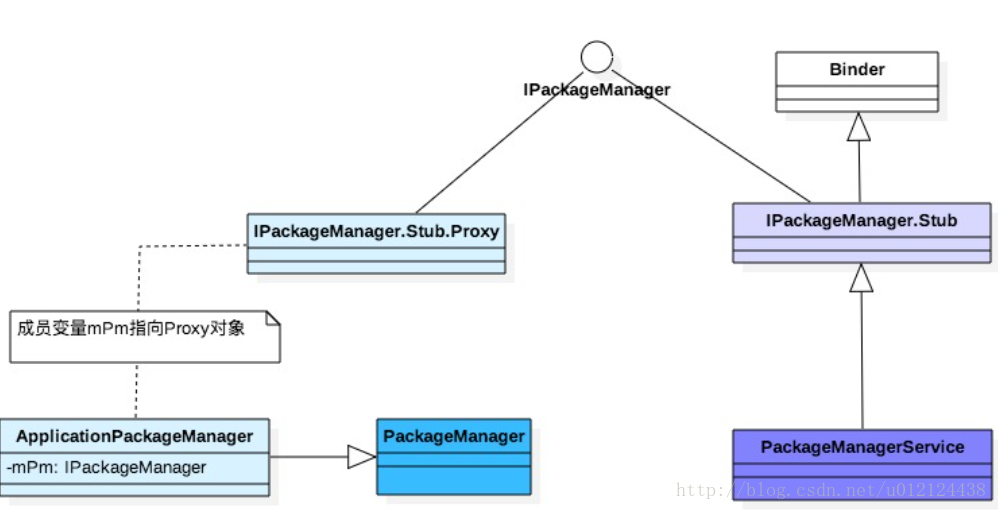 Binder客户端:ApplicationPackageManager(简称APM)的成员变量mPM继承于IPackageManager.Stub.Proxy; 本身APM是继承于PackageManager对象。