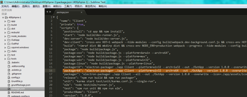 首先确保你的项目已安装electron-packager,因为我们要使用electron-packager进行第一步的打包,若未安装请安装,并在项目根目录的package.json的script下有类似这条的命令,命令里要有版本号,具体命令书写要求请阅读electron-packager的说明。