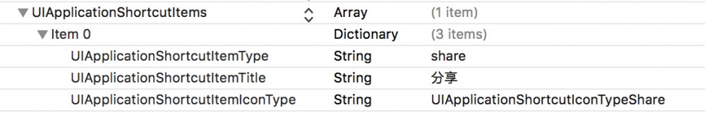 <key>UIApplicationShortcutItems</key> <array> <dict> <key>UIApplicationShortcutItemType</key> <string>share</string> <key>UIApplicationShortcutItemTitle</key> <string>分享</string> <key>UIApplicationShortcutItemIconType</key> <string>UIApplicationShortcutIconTypeShare</string> </dict> </array>