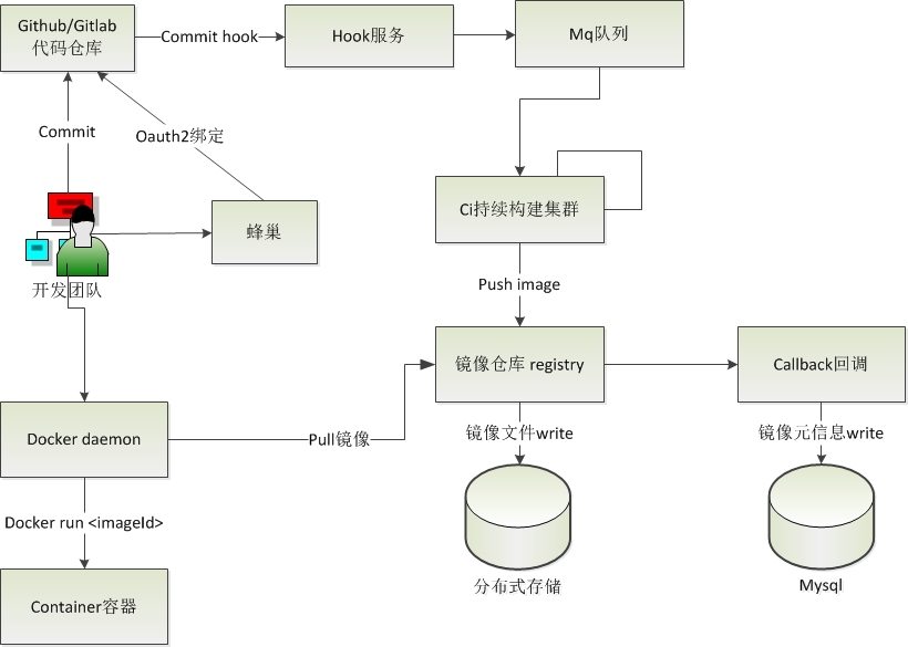 用户把 commit代码 push到仓库后, github/gitlab会回调 hook服务;hook服务获取相应的代码 commit信息,进行过滤后,把构建任务下发到任务队列,并在最后分发的持续构建集群对镜像执行构建;在构建成功后把镜像推送到 hub.c.163.com镜像仓库。