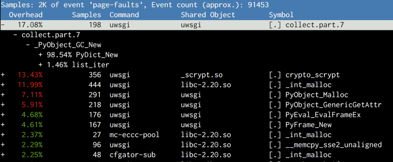 我们引导脚本添加了一个 gc.disable() 调用,然后重启了服务器。我们重新启动了服务器,但是,很不幸!如果我们再次查看perf,将会看到 gc.collect 仍然被调用,并且内存仍然被复制。利用GDB的一些调试,我们发现,使用的一个第三方库(msgpack)调用 gc.enable() 将其恢复,因此gc.disable()在引导时被清除。