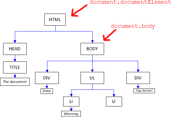DOM的根元素总是document.documentElement, 它是一个可以引用最开始的HTML标签的特殊属性。另一个起点的属性是document.body,它表示了BODY标签。