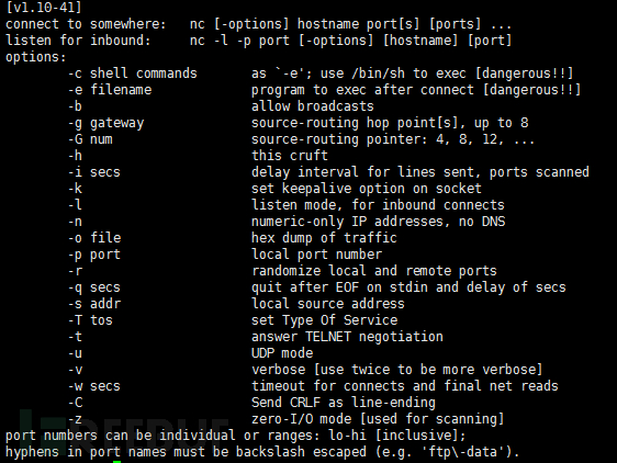 使用格式: nc [-参数] 主机名 端口[s] [端口] …