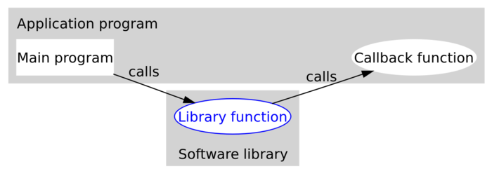 假设我们要使用一个排序函数来对数组进行排序,那么在主程序(Main program)中,我们先通过库,选择一个库排序函数(Library function)。但排序算法有很多,有冒泡排序,选择排序,快速排序,归并排序。同时,我们也可能需要对特殊的对象进行排序,比如特定的结构体等。库函数会根据我们的需要选择一种排序算法,然后调用实现该算法的函数来完成排序工作。这个被调用的排序函数就是回调函数(Callback function)。