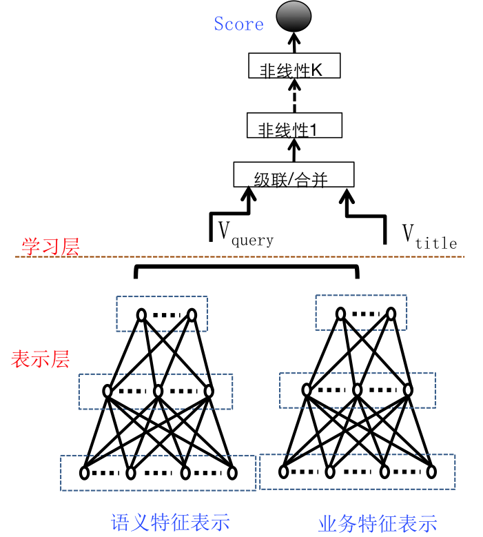 对Query和商家名分别用语义和业务特征表示,其中语义特征是核心,通过DNN/CNN/RNN/LSTM/GRU方法得到短文本的整体向量表示,另外会引入业务相关特征,比如用户或商家的相关信息,比如用户和商家距离、商家评价等,最终结合起来往上传。