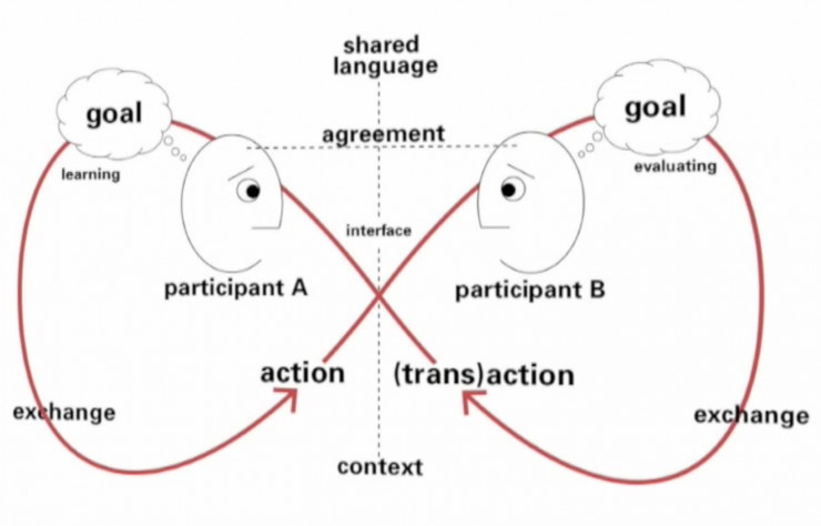 在两个人之间的对话,可以用下面这个模型表示,双方头脑中所要向对方表达的目标,需要通过语言来交换意见,为了达成共识,二者需要在一个语境下。