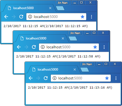 从上面的代码片段可以看出,针对分布式缓存和内存缓存在总体编程模式上是一致的,我们需要先注册针对DistributedCache的服务注册,但是利用依赖注入机制提供该服务对象来进行缓存数据的设置和缓存。我们调用IServiceCollection的另一个扩展方法AddDistributedRedisCache注册DistributedCache服务,在调用这个方法的时候借助于RedisCacheOptions这个对象的Configuration和InstanceName属性设置Redis数据库的服务器和实例名称。由于采用的是本地的Redis服务器,所以我们将前者设置为“localhost”。其实Redis数据库并没有所为的实例的概念,RedisCacheOptions的InstanceName属性的目的在于当多个应用共享同一个Redis数据库的时候,缓存数据可以利用它来区分,当缓存数据被保存到Redis数据库中的时候,对应的Key会以它为前缀。修改后的应用启动后(确保Redis服务器被正常启动),如果我们利用浏览器来访问它,依然会得到与前面类似的输出。
