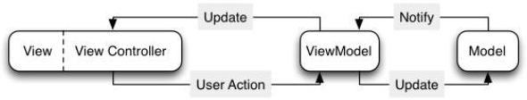 ViewModel: 相比较于MVC新引入的视图模型。是视图显示逻辑、验证逻辑、网络请求等代码存放的地方,唯一要注意的是,任何视图本身的引用都不应该放在VM中,换句话说就是VM中不要引入UIKit.h (对于image这个,也有人将其看做数据来处理,这就看个人想法了,并不影响整体的架构)。