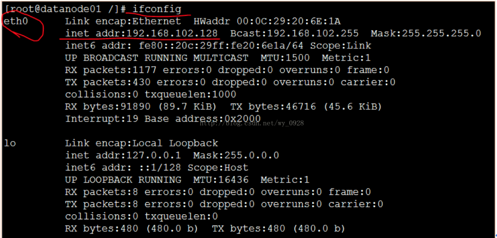 至此,第一台虚拟机的ip和mac配置完毕,接着配置第二台虚拟机的ip和Mac地址,输入vi /etc/udev/rules.d/70-persistent-net.rules修改,因为上面的MAC地址与第一台虚拟机相同,因此我们用下一个,并将网卡修改为eth0: