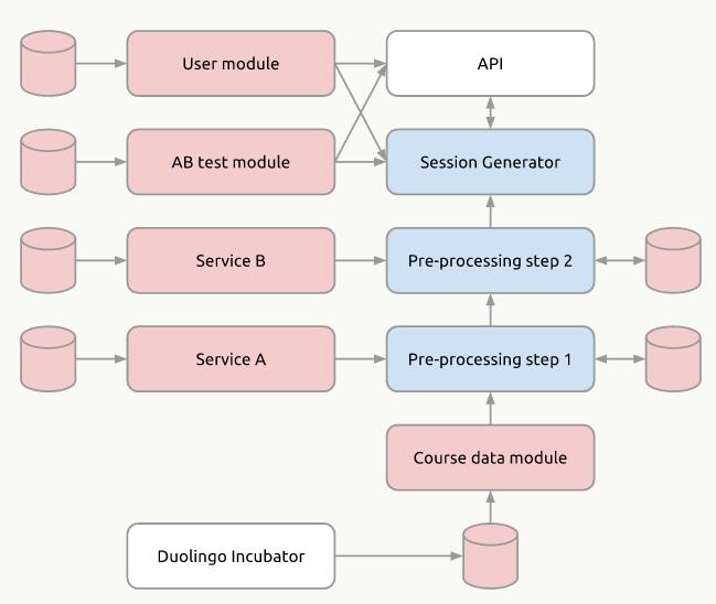 在系统设计之初,由于经常需要共享数据, Duolingo 的系统架构如下图所示: