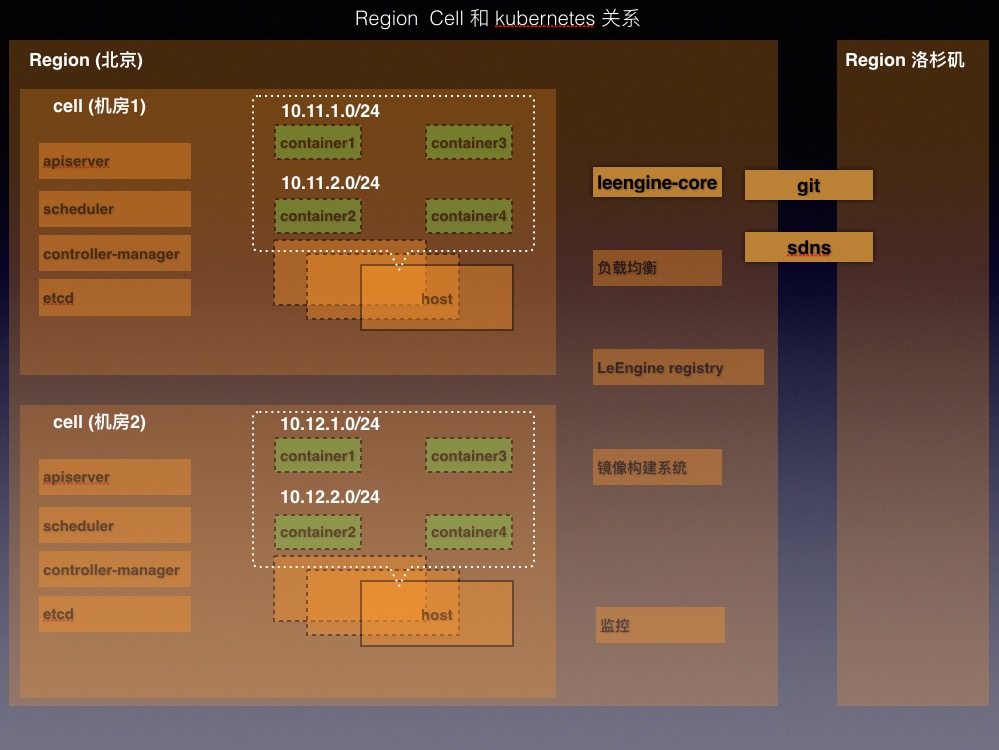 Cell: 我们现在使用的Kubernetes 1.2.0版本,理论上能控制1000个计算节点,为谨慎使用,规定一个kubernetes集群最大计算节点会控制在600个左右。 Cell 概念的引入是为了扩充单个Region下计算节点的规模,偏向于机房的概念,一个cell 即一个kubernetes集群,每个Region下可以搭建多个cell。所有cell共享本Region下的镜像Registry,镜像构建系统,负载均衡系统和监控系统。为同一个Cell下的容器配置一个或者多个网段,每个网段划分单独的vlan。同一cell下的计算节点不会跨机房部署。