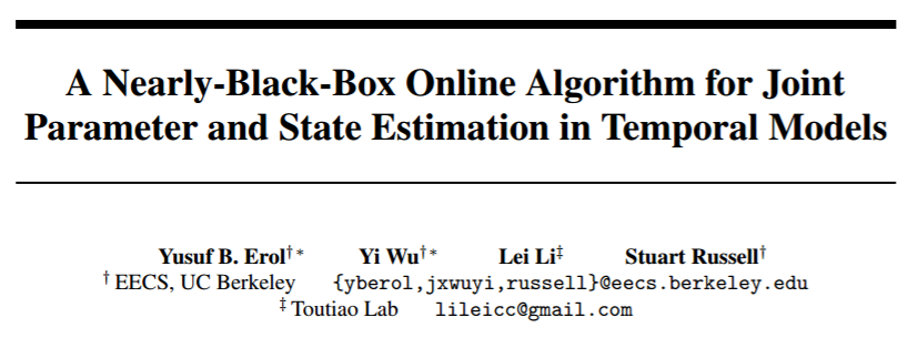 而在本届 AAAI 大会上,华人力量的崛起也是一个非常值得关注的看点。在接收论文的列表上,我们也能很明显地看到大量华人研究者的名字,当然,其中有很多论文实际上是中外研究机构合作的成果,比如由加州大学伯克利分校和今日头条实验室合作发表的论文《一个用于时间模型中联合参数和状态估计的近似黑箱的在线算法(A Nearly-Black-Box Online Algorithm for Joint Parameter and State Estimation in Temporal Models)》。这篇论文的作者有来自伯克利电气工程与计算机科学系的 Yusuf B. Erol、吴翼(Yi Wu)和 Stuart Russell,以及来自今日头条实验室的李磊(Lei Li)。