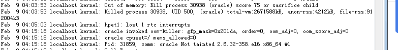通过上面的信息,我心里已经有了一个大概的方向,那就是这个环境没有开启大页,存在大量的swap争用。通过启动日志看到,SGA的设置不高,服务器配置比较低,所以资源使用也比较紧张,至于宕库原因很可能是因为内存资源不足导致的,如果没猜错就是oom-killer的情况。