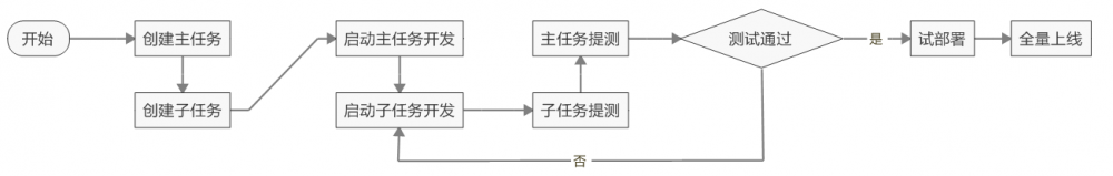 所有子任务完成后,主任务可以提测。主任务提测后,如果是人工测试,则测试人员介入开始执行测试任务;如果是自动测试,则开始运行集成测试脚本。