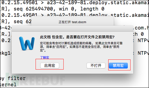 在动态分析过程中,分析人员将木马样本置于虚拟机中进行分析,发现用户点击“启用宏”是本次木马能够成功运行的关键前提。如下图所示。