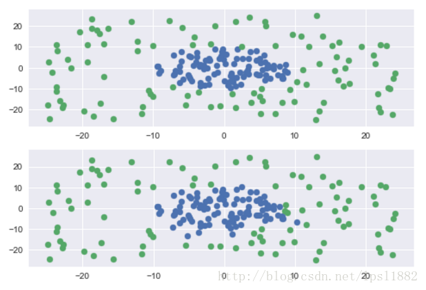 resA = sess.run(alpha) predict=np.multiply(resA,x[:,2]) #print(predict.shape) predict=np.sum(np.multiply(predict,kkx),axis=0) predict = predict.T predict=np.tile(predict,[1,3]) #print(predict>0.0) ax = np.array(x) predictSet1=ax[predict>0.0].reshape([-1,3]) predictSet2=ax[predict<0.0].reshape([-1,3]) fig = plt.figure() ax = fig.add_subplot(211) ax.scatter(x=data1[:,0],y=data1[:,1]) ax.scatter(x=data2[:,0],y=data2[:,1]) ax = fig.add_subplot(212) ax.scatter(x=predictSet1[:,0],y=predictSet1[:,1]) ax.scatter(x=predictSet2[:,0],y=predictSet2[:,1]) fig.show()