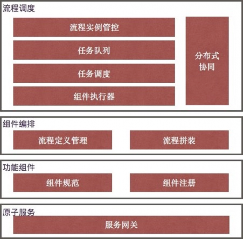 一键建站涉及的单元产品种类繁多,相关操作保罗万象,而且变化极为频繁。如果为每类产品写死操作流程,那建站只会疲于代码,即使完成了代码,也只会是一次性的玩物。因此建站需要更多的考虑灵活性,在最终的技术实现上,将系统架构分为四个层次,原子服务、功能组件、组件编排以及流程调度。系统架构如下图: