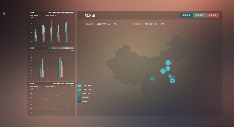 本项目完全采用组件化的思想进行开发。使用vue-router作为路由,每个页面都是一个组件,每个组件里又包含多个组件。可以看到,多种图表的标题和日期筛选等都是类似的格式,所以这两个都分别做成了组件。