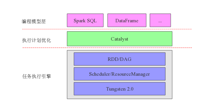 SparkSQL体系结构如下图所示,整体由上到下分为三层:编程模型层、执行任务优化层以及任务执行引擎层,其中SparkSQL编程模型可以分为SQL和DataFrame两种;执行计划优化又称为Catalyst,该模块负责将SQL语句解析成AST(逻辑执行计划),并对原始逻辑执行计划进行优化,优化规则分为基于规则的优化策略和基于代价的优化策略两种,最终输出优化后的物理执行计划;任务执行引擎就是Spark内核,负责根据物理执行计划生成DAG,在任务调度系统的管理下分解为任务集并分发到集群节点上加载数据运行,Tungsten基于对内存和CPU的性能优化,使得Spark能够更好地利用当前硬件条件提升性能,详情可以阅读 Project Tungsten: Bringing Apache Spark Closer to Bare Metal 。