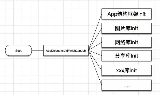 AppDelegate中包含大量库的init以及其他操作,少则几百行,多则上千行,无关代码堆积在其中,维护成本极高,不同库的调用逻辑互相交错,如下图所示: