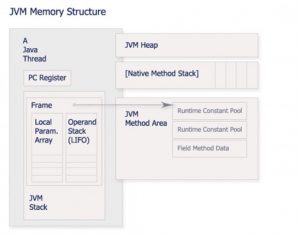线程私有,存放的是Java方法执行时的数据,既描述的是Java方法执行的内存模型:每个方法开始执行的时候,都会创建一个 栈帧(Stack Frame)用于储存局部变量表、栈操作数、动态链接、方法出口等信息 。每个方法从调用到执行完成就对应一个栈帧在虚拟机栈中入栈到出栈的过程。局部变量表存放的是编译器可知的各种基本数据类型(boolean 、byte、int、long、char、short、float、double)、对象引用(reference)和returnAddress类型(它指向了一条字节码指令的地址)。在Java虚拟机规范中,对这部分区域规定了两种异常: 1、当一个线程的栈深度大于虚拟机所允许的深度的时候,将会抛出StackOverflowError异常; 2、如果当创建一个新的线程时无法申请到足够的内存,则会抛出OutOfMemeryError异常。