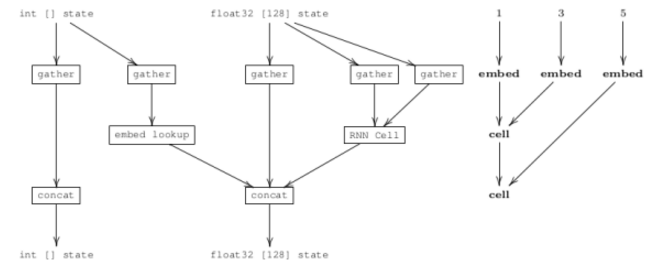 上面这一幅图来着官方论文,左边是Dynamic Batching为二叉TreeRNN构建的通用计算图。右边是一颗简单的语法解析树。通用计算图中有两种Tensor,代表单词的编码整数、词向量/hidden向量的128维向量。Operation也只有两个一个词向量查表操作(embed lookup)和一个RNN的Cell。图中gather和concat之间的直连表示直通(pass-through)操作。右边的语法解析树可以分为三层计算被执行:第一层,将1、3、5通过词向量查表操作,输出3个128维的词向量;第二层,1和3对应的词向量通过RNN Cell输出一个128维的隐含层向量,5对应的词向量直通输出;第三层,上一层计算的隐含层向量和5对应的词向量通过RNN Cell,输出一个128维的隐含层向量。计算完毕。