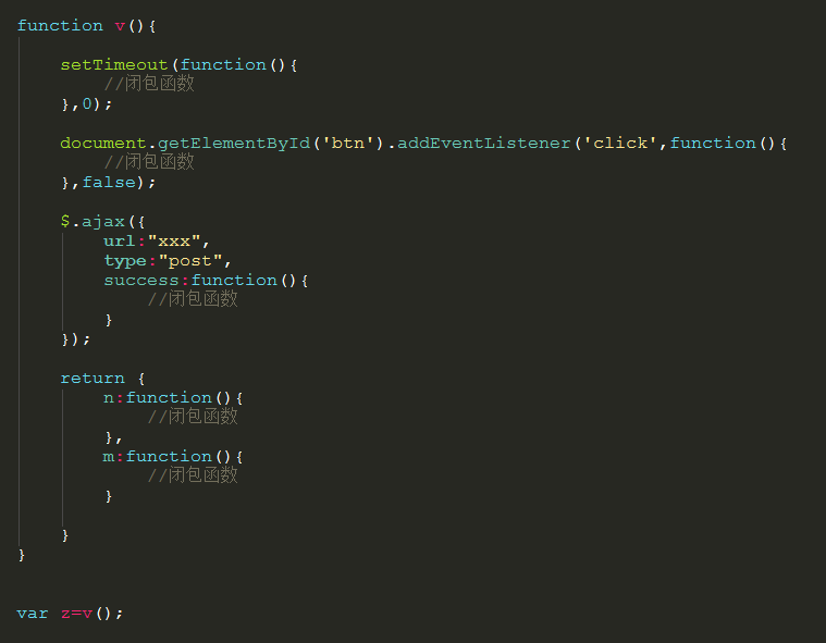 在这个例子中,父函数v()体内定义了好几种子函数,这些子函数有的是异步事件的回调函数,会进入浏览器的事件循环池,等主线程工作结束后日后再调用这些回调函数,这些子函数,都导致父函数调用完了,不敢注销自己的作用域,因此这些子函数都是闭包函数。