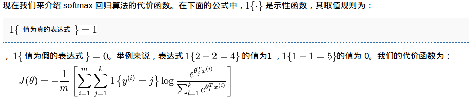 绝大部分的机器学习算法最后都是最优化一个目标函数,而梯度下降算法是寻找一个函数局部最优解的有效方法。我做了个例子,用Softmax实现mnist上的分类器(手写数字识别),具体代码参见 GitHub .Softmax 的详细介绍可以参照 ufldl 使用交叉熵作为误差函数Softmax 的目标函数可以用下图中的公式表示。