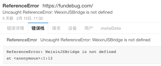 对于Fundebug这样一个没有使用微信JS-SDK的产品来说,我们竟然收到了 WeixinJSBridge is not defined 的报错: