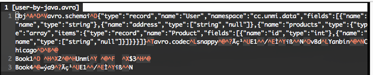 上面的代码序列化了两个 User 实例,并写到了 ../user-by-java.avro 文件中, 数据部份用了 snappy 进行压缩。