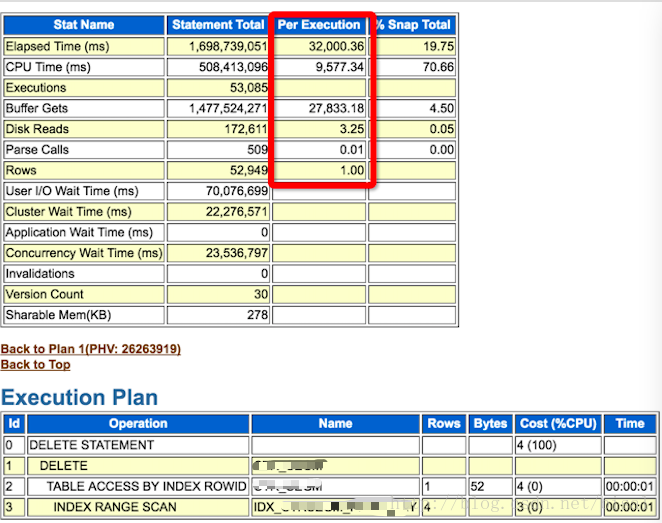 出现性能问题的SQL消耗信息和执行计划如下(生成方式可参见《一个执行计划异常变更的案例 -