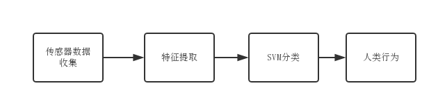 如上图所示,信号数据的采集来自于嵌入在智能手机中的加速度传感器,实验选用了人类日常行为中的六类常见行为,分别为:走路、慢跑、上楼梯、下楼梯、坐、站立,数据收集后,对数据进行特征抽取,抽取后的特征使用支持向量机的分类功能对特征进行分类,最后识别出人类的六类行为。