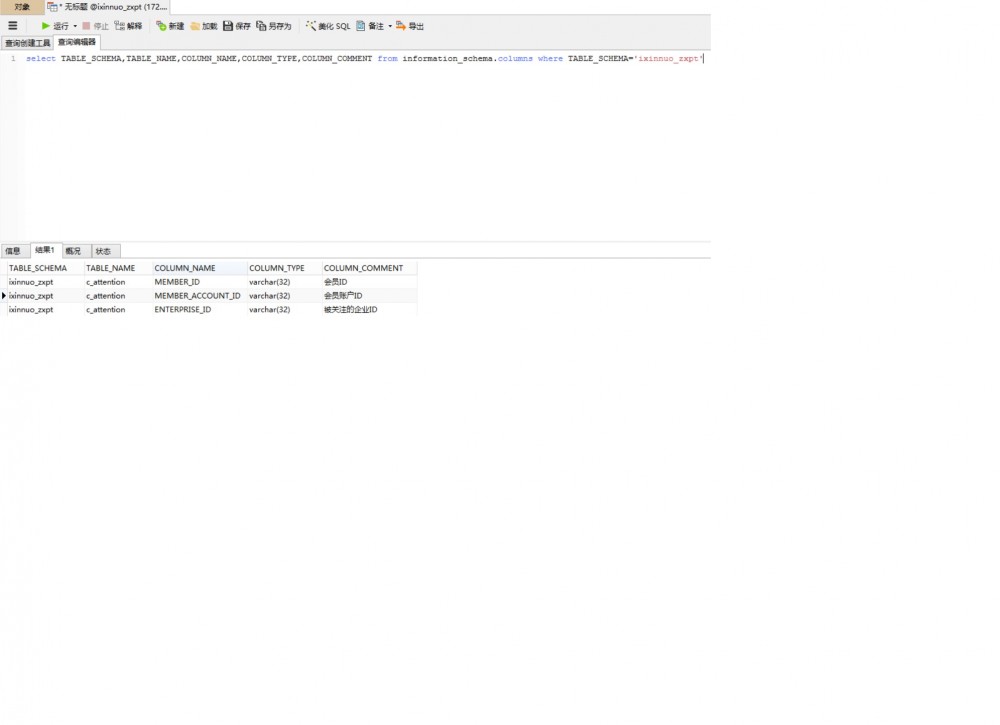 select TABLE_SCHEMA,TABLE_NAME,COLUMN_NAME,COLUMN_TYPE,COLUMN_COMMENT from information_schema.columns where TABLE_SCHEMA='ixinnuo_zxpt'