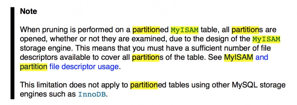 根据MyISAM引擎的设计, 基于MyISAM的分区表在操作的时候, 会打开表中所有的分区;
