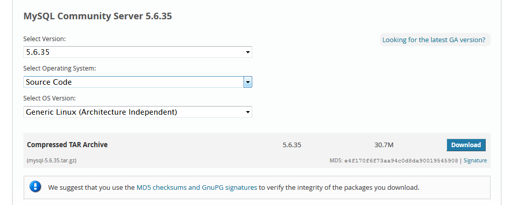 比如说我选择的是这个5.6.35的版本。最新的是5.7的,再早一些的是5.5版本的,之前的还真不好找了,得通过其他渠道了。