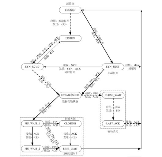 图中实线为主动方,虚线为被动方,比如SERVER-CLIENT端,CLIENT端请求断开连接那么他就是主动方