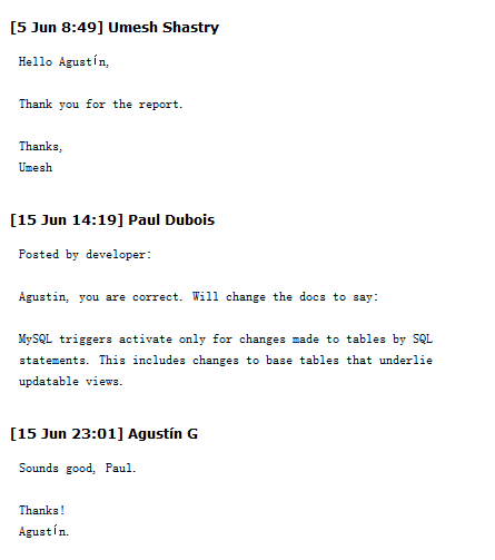 这个描述看起来没什么问题,毕竟触发器是确实存在于具体的表上的,由表来触发听起来无可厚非。但是Agustín认为官方文档的描述不够严谨,而且主动提交了一个bug给官方,当然他这么说,一来是对这方面的内容有深入的理解,而另外一方面是他做了大量的测试,涵盖了MySQL 5.5, 5.6, 5.7.18(目前最新的版本),所以就事论事,这是一种很专业,严谨的态度。