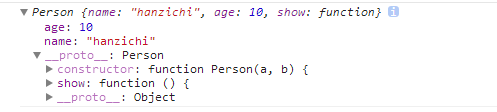 function Person(a, b) { this.name = a; this.age = b; } Person.prototype.show = function() { console.log(this.name, this.age); }; var p = new Person('hanzichi', 10); console.log(p);