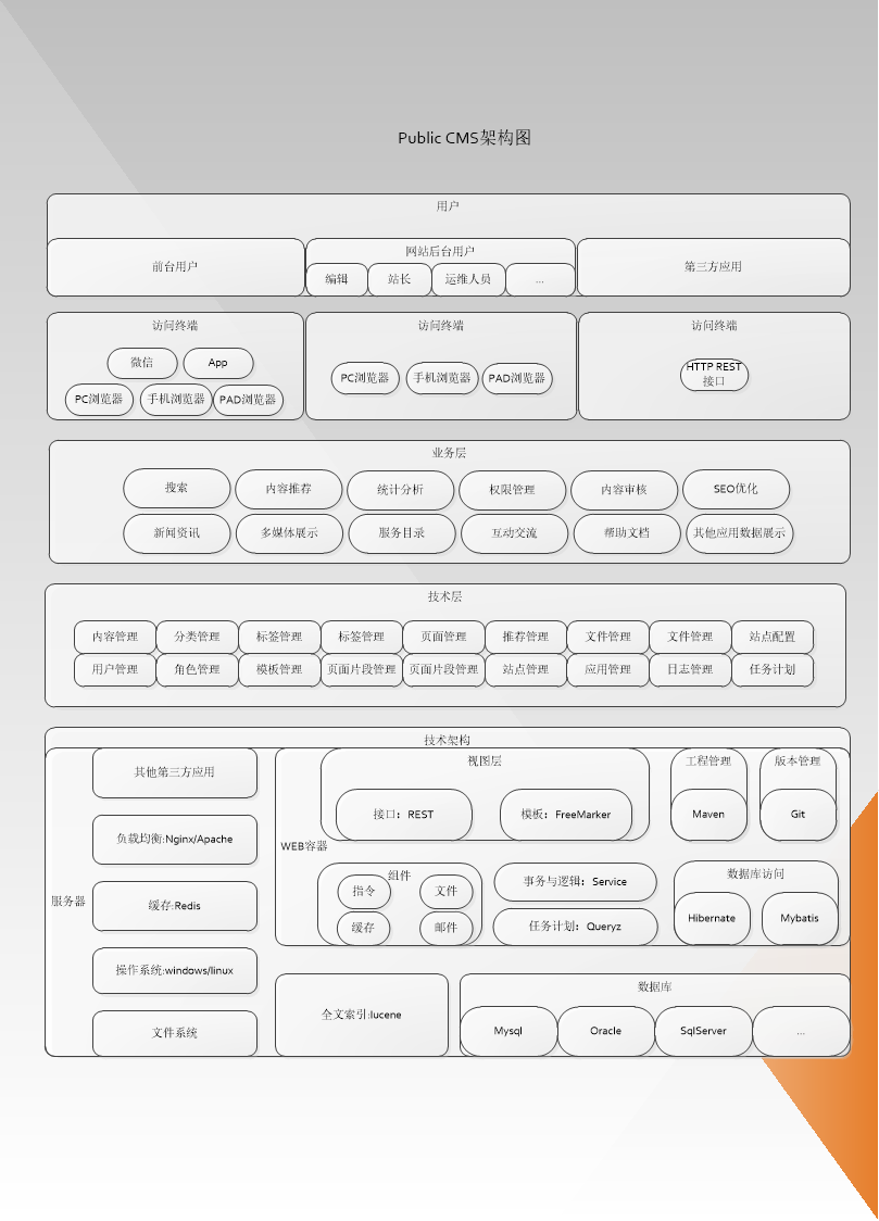 PublicCMS是采用2017年最新主流技术开发的免费开源JAVACMS系统。架构科学,轻松支持千万数据、千万日PV;支持全站静态化,SSI,动态页面局部静态化等为您快速建站,建设大规模站点提供强大驱动,也是企业级项目产品原型的良好选择。